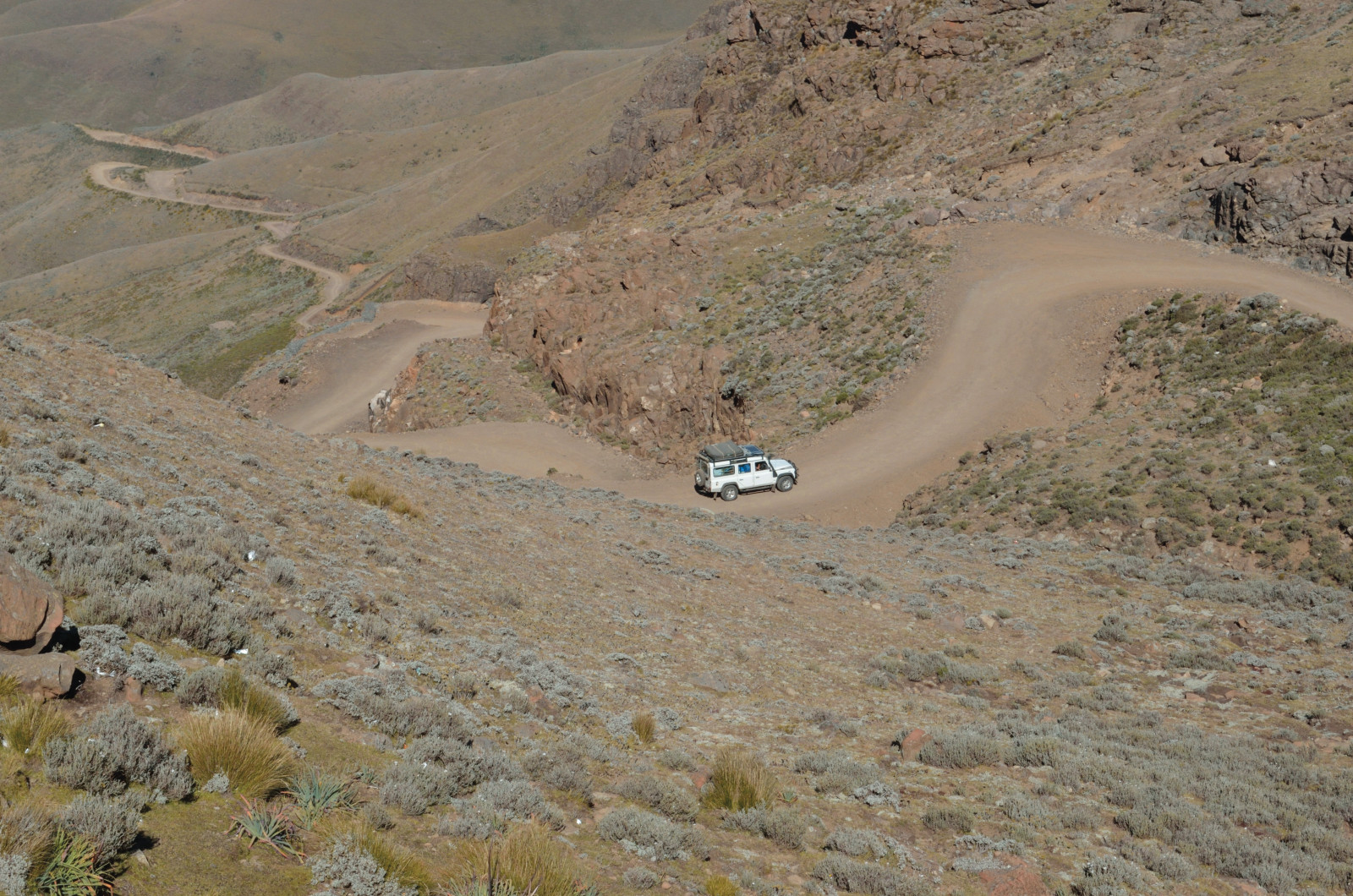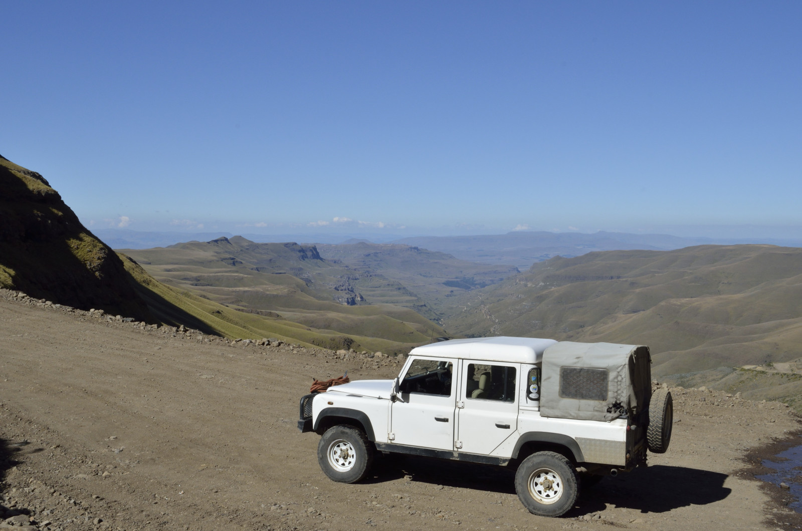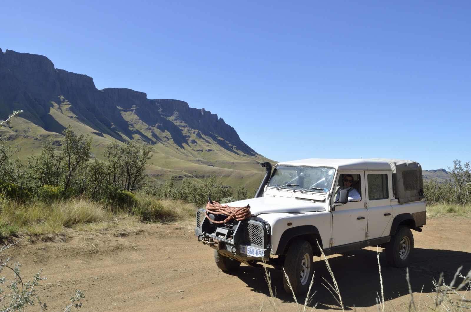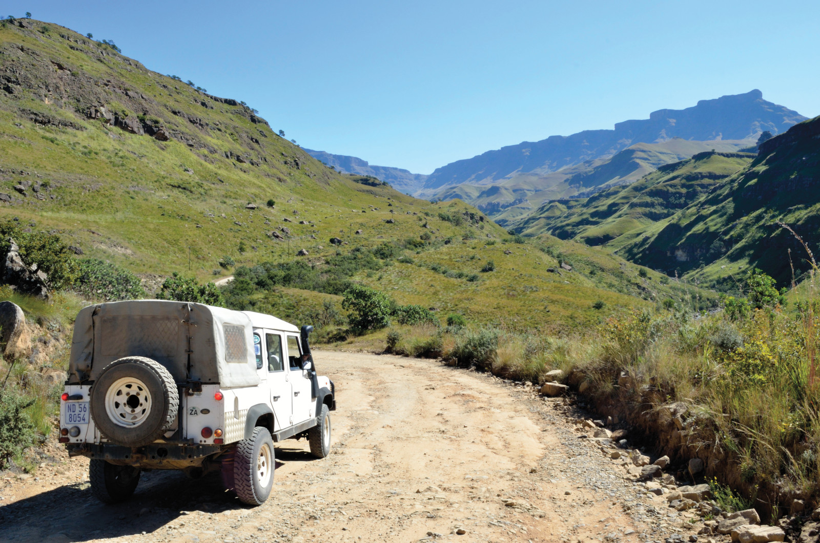 From the Midlands we ventured up into the quiet mountain kingdom of Lesotho. The most accessible route is via Sani Pass, a craggy breach in the fortress of the Drakensberg. A steep, primitive track carved into the rocky slopes ascends to the pass—with no guardrails. Low range second gear brought us to the border post without drama, catching our breath at 9,300 feet. Wreckage of a destroyed vehicle was a sobering reminder of the route’s hazards.