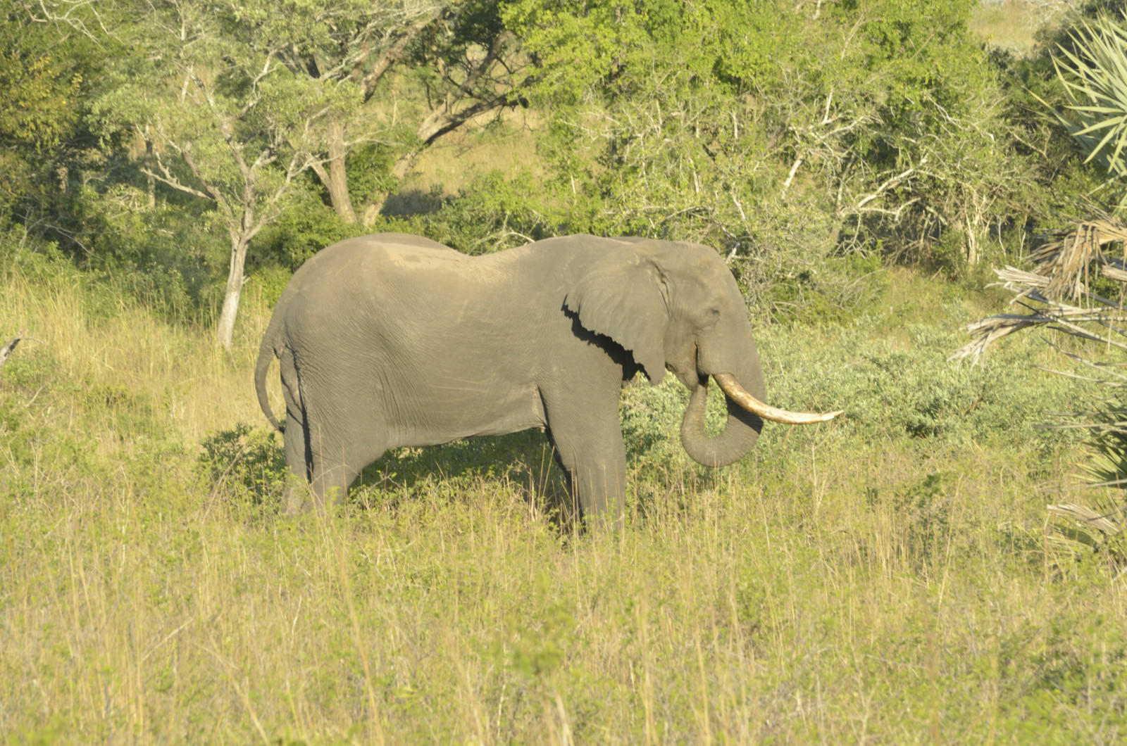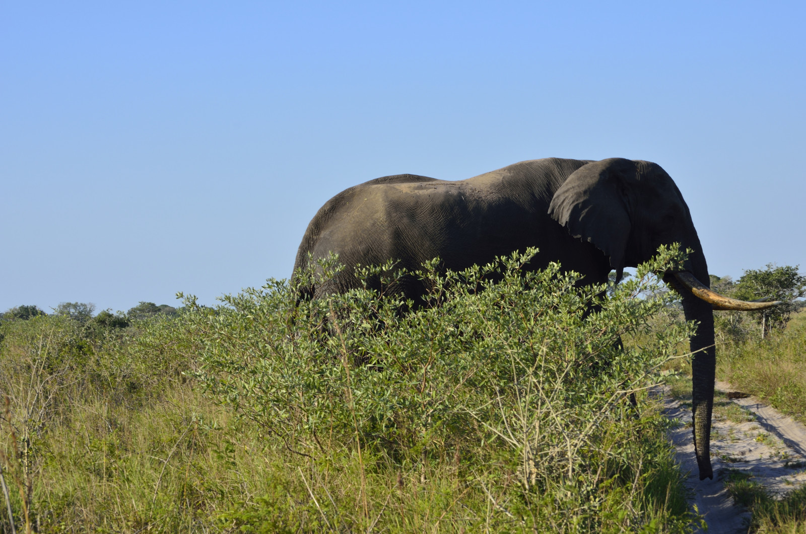 Jenna and I had our own close encounter one afternoon, piloting the Defender through the northern restricted reaches of the park. A lone bull elephant walked slowly towards us in silence, passed within 30 feet of our Rover, and settled in for some tasty foliage on the other side of the track. It was a magical moment in the presence of this graceful creature.