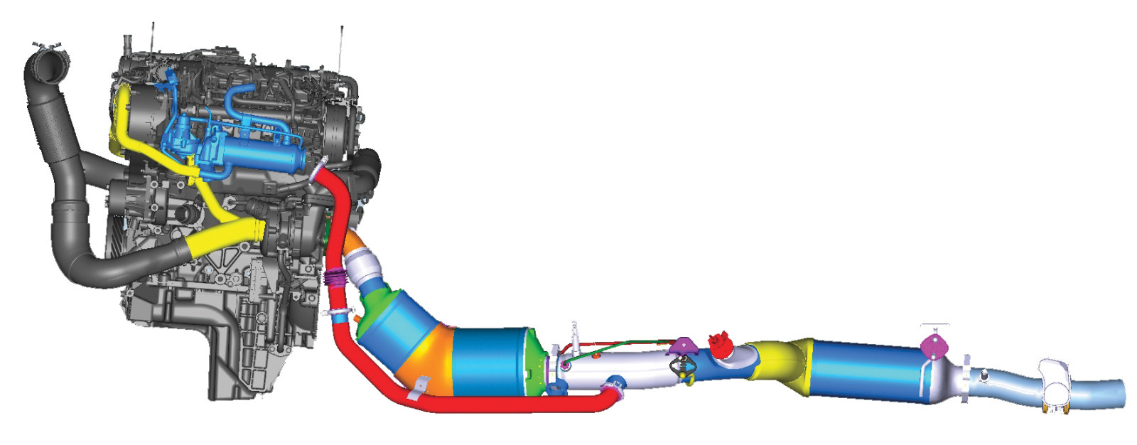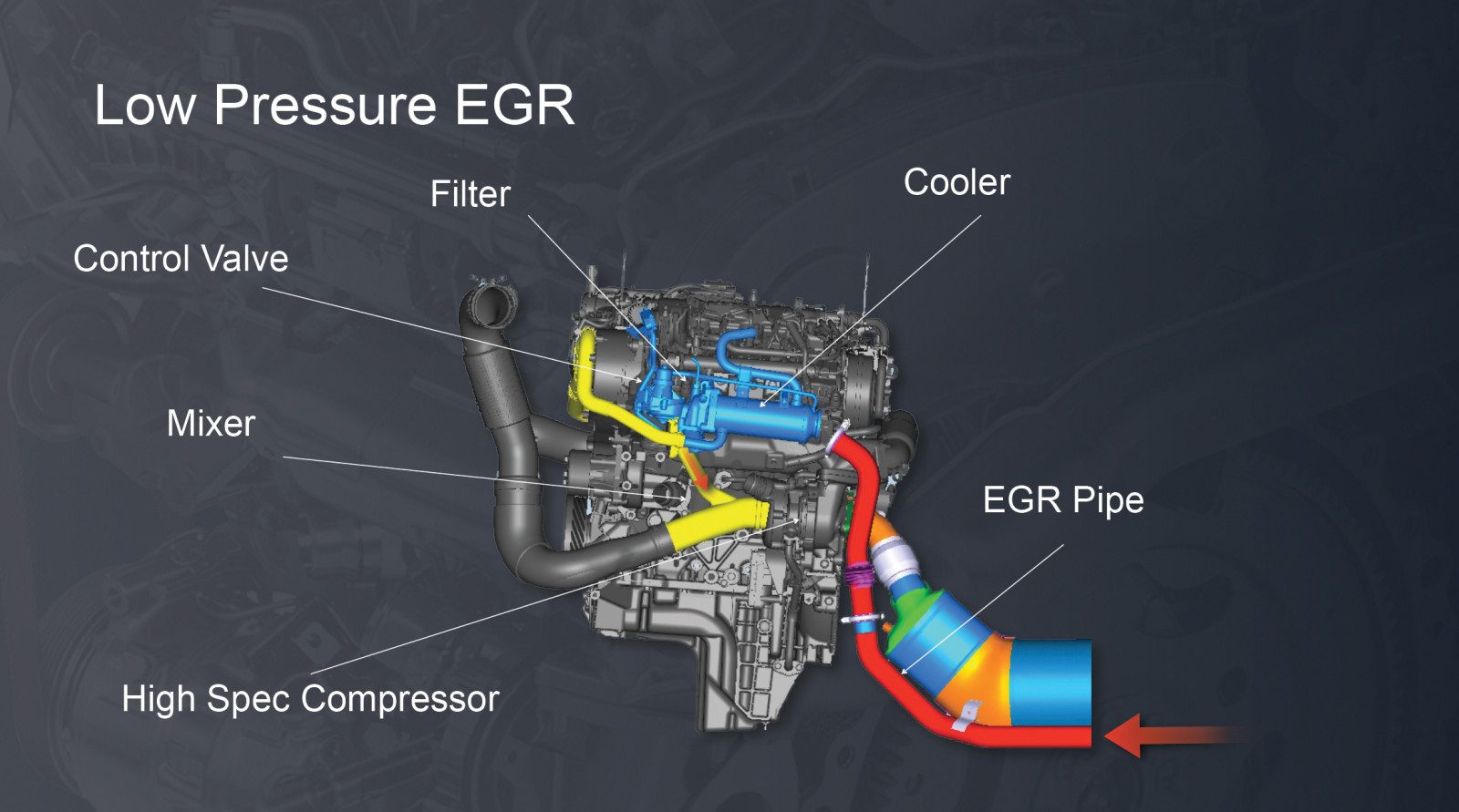 Under the hood, a new Low Pressure EGR system reduces emissions while improving fuel economy. Unlike traditional High Pressure EGR systems, which recirculate gases directly from the exhaust manifold to inlet manifold at high pressure, the revised design takes gases at low pressure—after the DPF filter in the exhaust pipe—and feeds them back to the turbocharger inlet. From here they pass through an intercooler, resulting in a lower peak combustion temperature. The higher the peak combustion temperature, the more NOx is produced, so the low pressure EGR system has the effect of reducing the level of NOx produced by lowering the peak combustion temperature and improving efficiency. Also, revised fuel injectors employ a two-stage process to eliminate the common “diesel knock.”