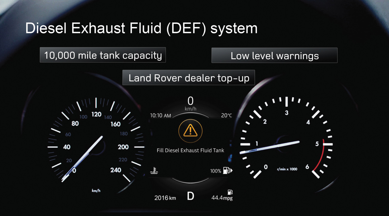 A Selective Catalytic Reduction (SCR) system uses Diesel Exhaust Fluid (DEF) to reduce NOx emissions, ensuring the Td6 achieves US LEV 3 status. The DEF is injected into the exhaust and, as the resulting mixture passes through the SCR, NOx is turned into harmless nitrogen gas. The easily-accessed reservoir for the DEF holds enough fluid for approximately 10,000 miles. Land Rover uses generally available diesel exhaust fluid and owners can top it off themselves.