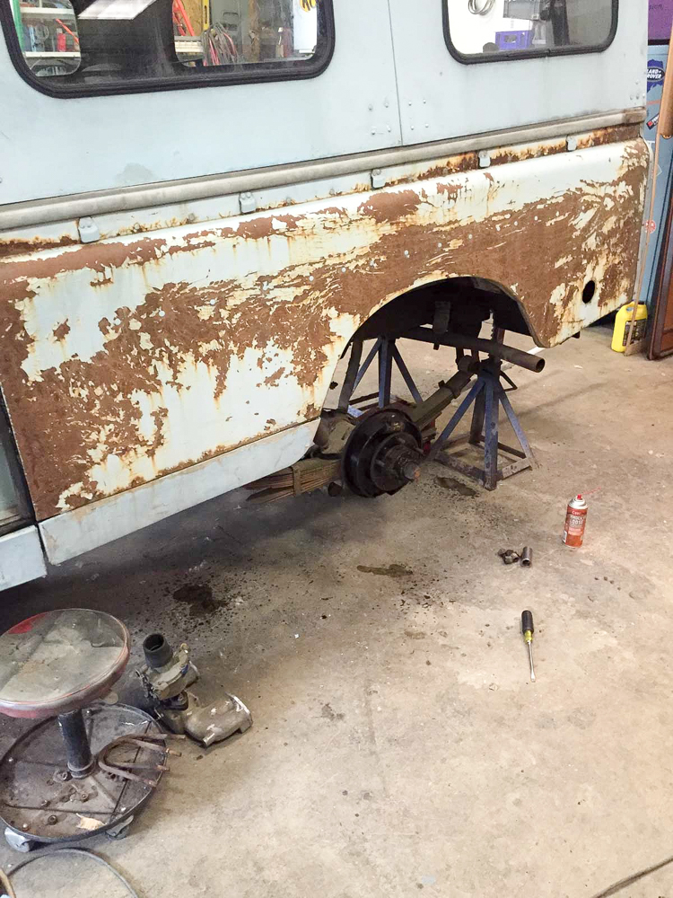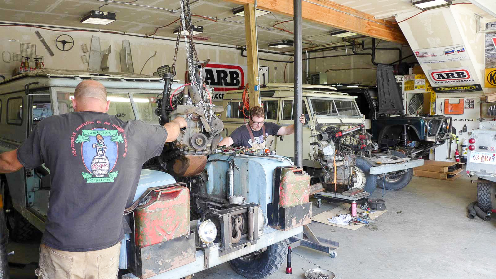 “Last July, I received word from Michael Rudd that three of the British expeditioners would return in August to complete their trek. Pulling it into the shop, I was overwhelmed as to where to start. I inventoried its needs and contacted Rovers North, which agreed to become a sponsor and supplied us with these essential parts. The 2.25 motor that was in it was not the original—it had overheated. The head was bad, so I put an 8:1 rebuilt head. The rings and pistons looked good with shiny walls and just a small lip at top. The rod bearings were good to go. I drove it around the yard without brakes and the tranny and transfer case were ok. But the rear axle housing was so bent that I needed a slide hammer to remove the left axle shaft—no wonder they went through halfshafts! Now it has the later Salisbury axle. I checked the lash at the differentials (the front differential had been brazed at one point) and went through the swivel balls, replaced bushings, u-joints and other wear items. Kathryn does the wiring and she created clean grounds. And that original hydraulic winch pulled like nobody’s business.”