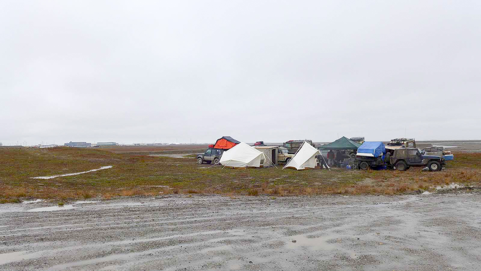 The last 500 miles were incredible. It took us two days from Fairbanks to Coldfoot, where we camped, and then another day to Deadhorse. It was rainy and miserable. We set up camp in the mud, huddled together. On our final day, we split into two groups to Deadhorse. The road was very muddy for 50 miles—gravel, but with some washouts that kept it in poor shape. It turned into a soupy gravel. We were in four-wheel drive, foot to the floor, barely doing 50 mph. It crossed my mind as to whether all these vehicles would make it. Everyone made it—no breakdowns at all.”