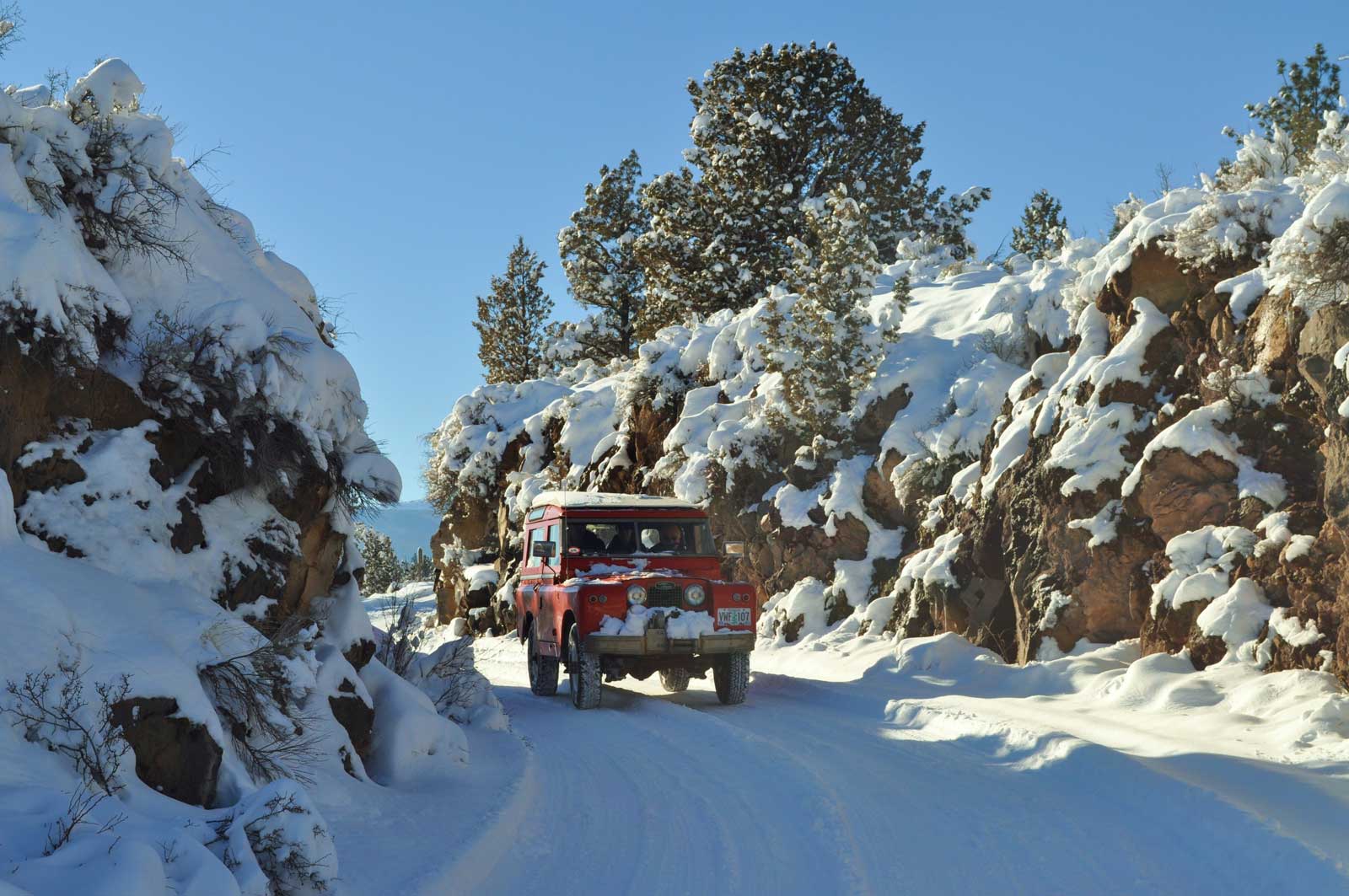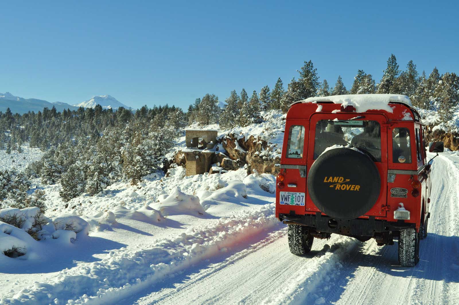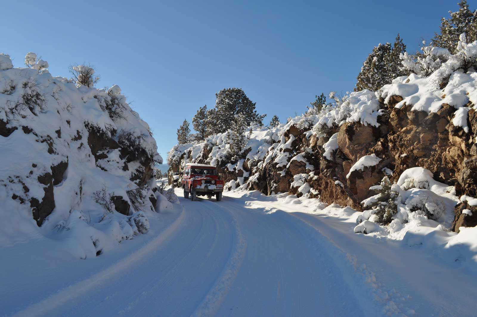 Set at the base of the Three Sisters and bordering national forest land, I consider this region a Land Rover heaven. After a recent 10” snowfall during Thanksgiving break, my wife Linda, daughter Liz, friend Trevor and I set out in my Series IIA 88” for a tour of the snowy sights. We motored across the top of the spillway (82’ above the valley) and through a rock cut beyond. One can see the remnants of the old control tower beside the roadway. We made our way past cross country skiers to the bridge over Bull Creek, which fills only a tiny portion of this area to only 11’ depth. In the distance we saw Broken Top to the left, and the South, Middle and North Sisters keeping watch over their 10,000 ft. elevation. In the 1920s, folks from nearby Bend would set up a wireless and use one of the indigenous Juniper trees as an antenna mast to catch a radio signal from San Francisco while ice skating. On this particular day we watched a sled dog team harnessing up for a run across Bull Flat. A dog sled team is pretty efficient for crossing snowy ground, but I’ll stick with my 88”—the heat is a bit better!