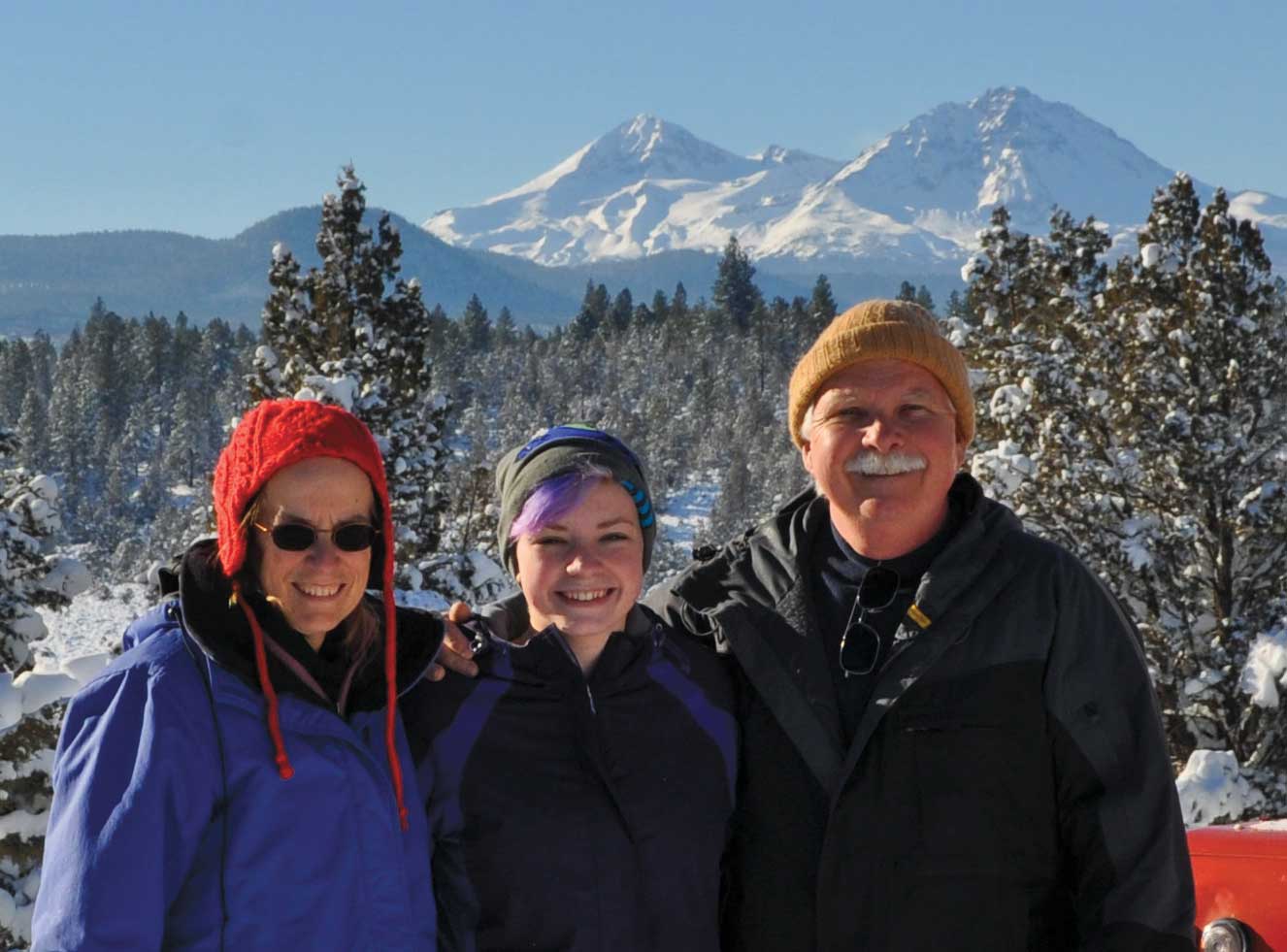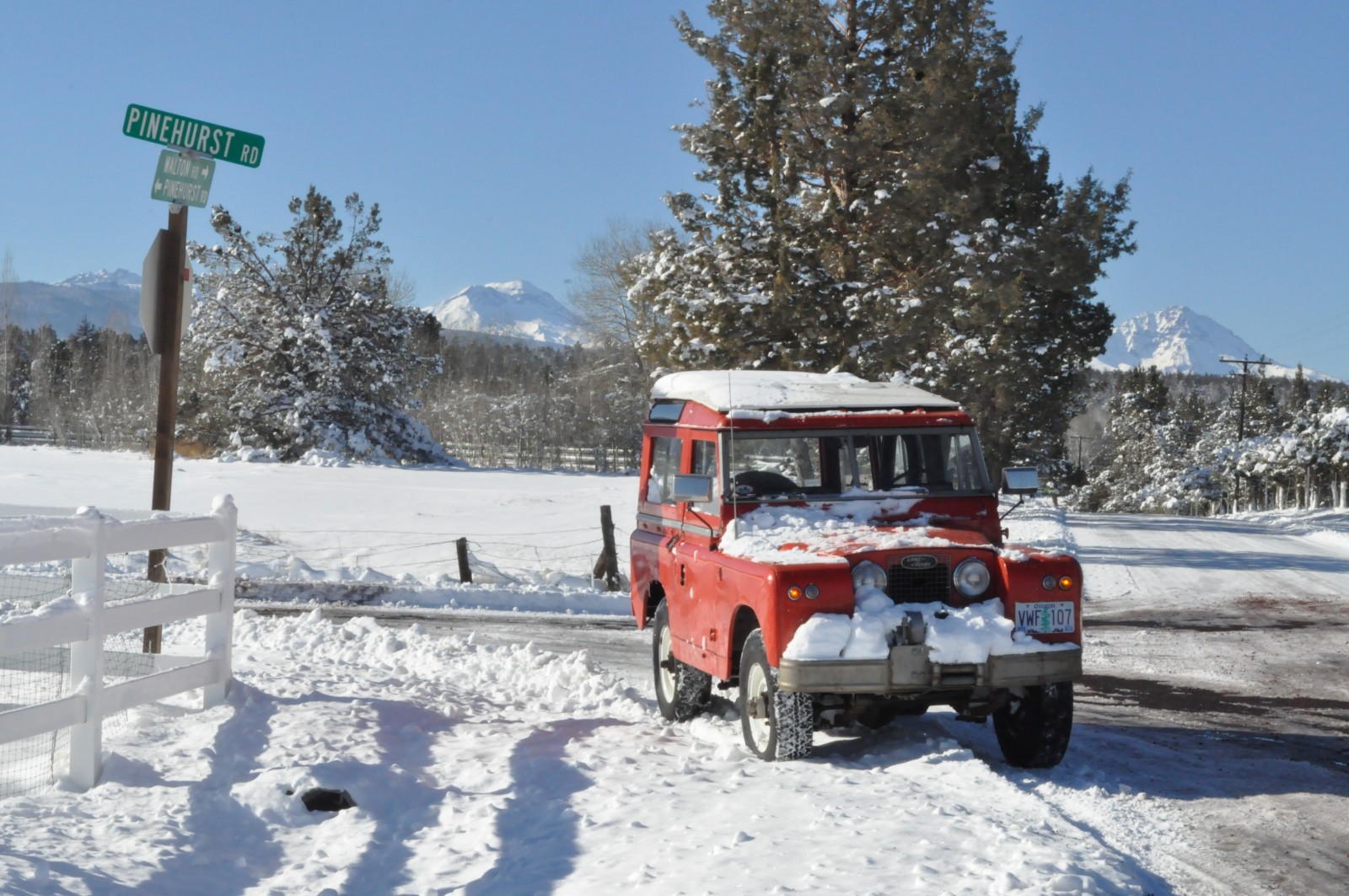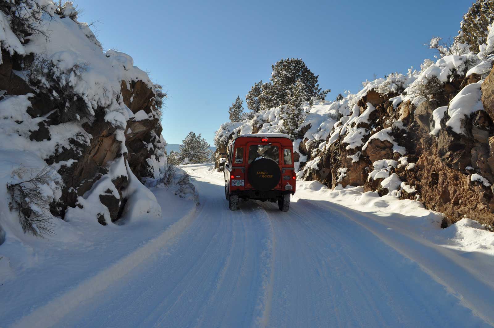 Set at the base of the Three Sisters and bordering national forest land, I consider this region a Land Rover heaven. After a recent 10” snowfall during Thanksgiving break, my wife Linda, daughter Liz, friend Trevor and I set out in my Series IIA 88” for a tour of the snowy sights. We motored across the top of the spillway (82’ above the valley) and through a rock cut beyond. One can see the remnants of the old control tower beside the roadway. We made our way past cross country skiers to the bridge over Bull Creek, which fills only a tiny portion of this area to only 11’ depth. In the distance we saw Broken Top to the left, and the South, Middle and North Sisters keeping watch over their 10,000 ft. elevation. In the 1920s, folks from nearby Bend would set up a wireless and use one of the indigenous Juniper trees as an antenna mast to catch a radio signal from San Francisco while ice skating. On this particular day we watched a sled dog team harnessing up for a run across Bull Flat. A dog sled team is pretty efficient for crossing snowy ground, but I’ll stick with my 88”—the heat is a bit better!