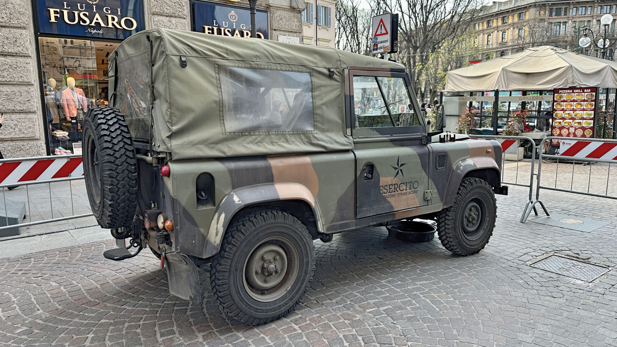 On our first day in Milan, I spotted this Defender 90 on a closed, pedestrian-only street (Via Dante) with many high-end shops and spied a second Defender stationed at the other end of the street. Two guards, each with automatic rifles, stood beside their Defenders. I walked up to them and said in English, “Defender. Turbo Diesel 300 Tdi. I work for a Land Rover parts specialist. Can I take a photograph?” They laughed and said, “Defender, of course, but not us.” We all smiled at the huge oil drip pan beneath the front end; they travel with those pans. The very cool guards all said their Defenders just keep going and going over everything — except the drip pans.