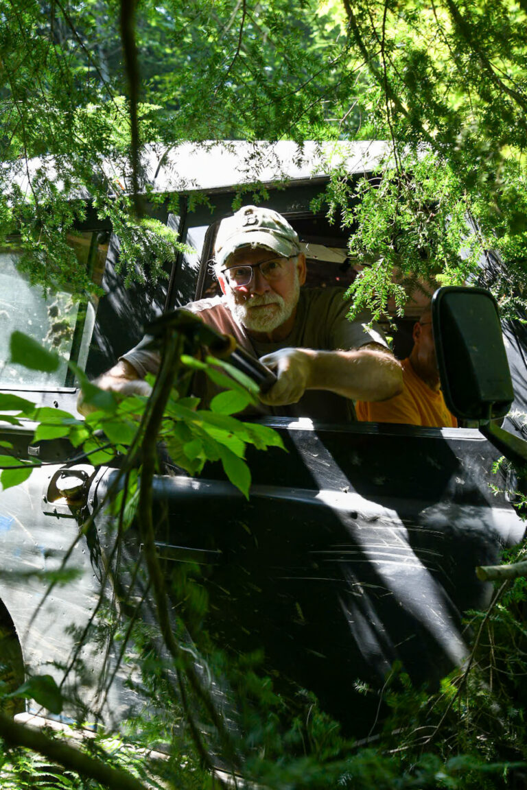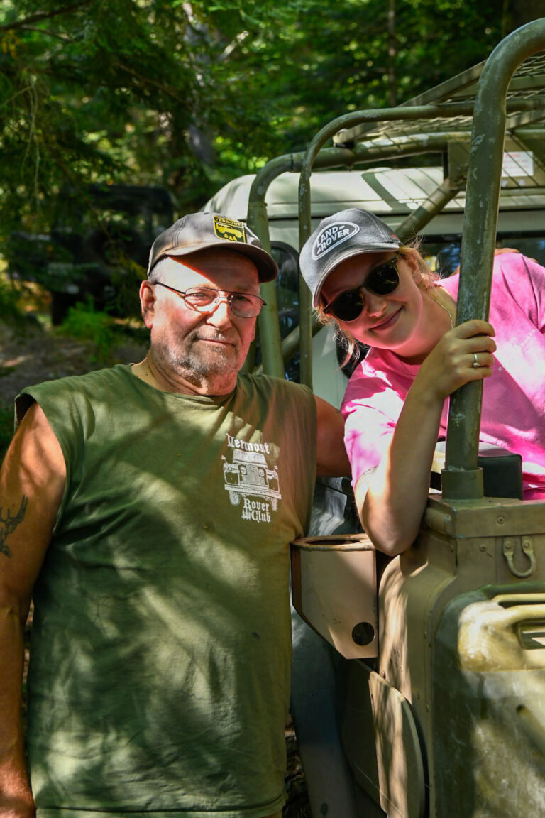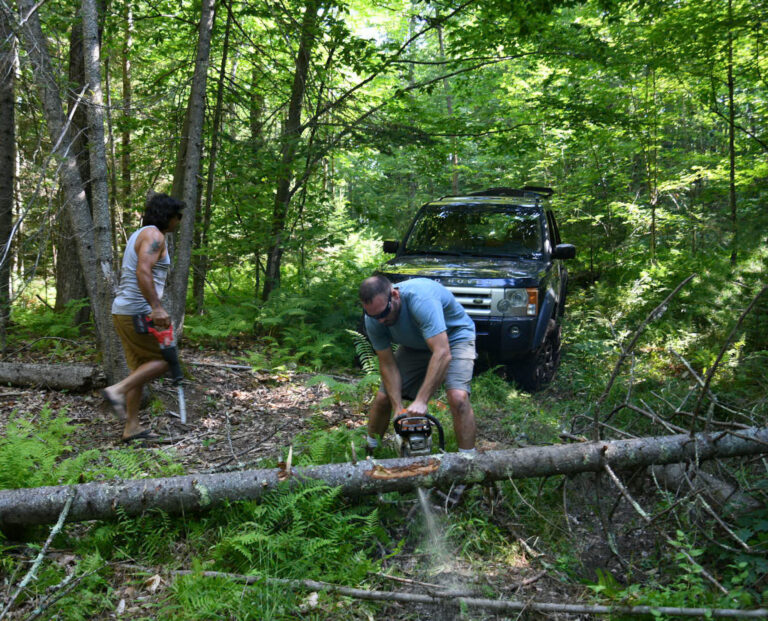 Then came the new trails, courtesy of a crew of club volunteers who altered the “Lower Loop Trail” to create a “No Scratch Zone” intended to give new enthusiasts confidence in driving through forest lands. Mainers (and Honorary Vermonters) Vince Vallerand, Bruce Fowler, Joshua Morgan, Ryan Swett and Logan Austin spent a weekend before the event reclaiming and repurposing old trails that had become overgrown. Greg Brown, Niantic, CT, put Bruce in the passenger seat of his ’73 Series III diesel, named “George,” and slowly puttered around the trails. Mildly concerned at his stop-start pace, I checked in with them, only to find Bruce leaning out of the passenger side window pruning branches and taking tree trimming to the next level. As they traveled the trails, Greg took GPS readings, enabling me to create and print trail maps for participants.