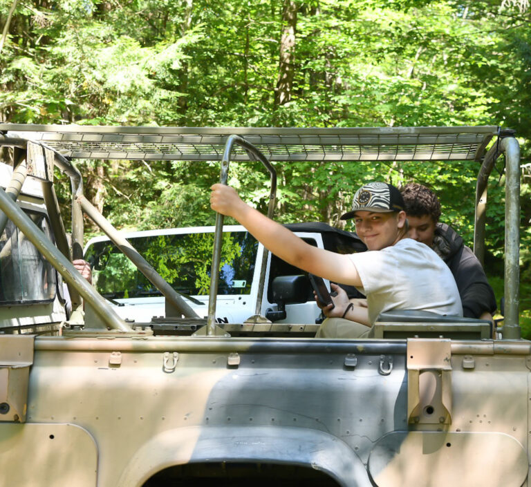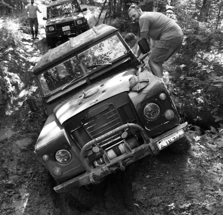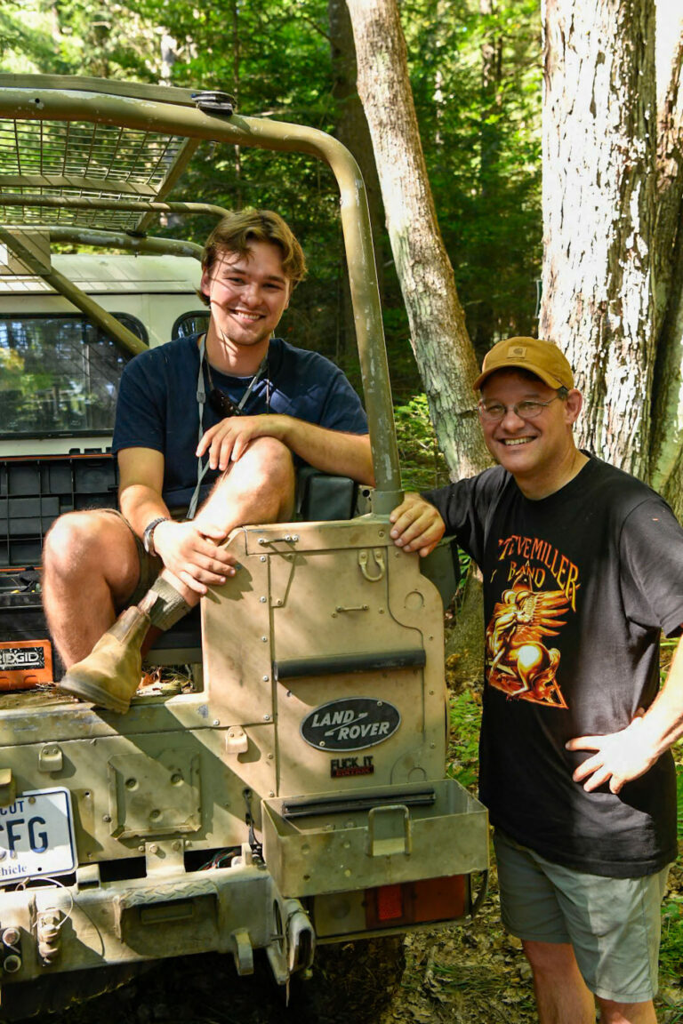 We stuffed ourselves into my Land Rover, with young Rowan Kenney, Taunton, MA, joining Cathy in the back seat. As we toured the perimeter of the property, I felt as though I had traveled back in time to when I drove under my Learner’s Permit, with my Mon nervously watching every turn and wincing with each braking motion. Off-roading was not common for her, but I think she might have been hooked. As she told me later, “My very scenic ride through the ‘Misfits’ woods and riverbeds was full of unexpected muddy bumps and lurches. It was a beautiful day and it was fun watching grown men winch their Rovers out of the ruts as if they were still young boys playing in the dirt with their trucks! My ride was exhilarating, but I have to say — that is not how we taught our son to drive all those years ago.”