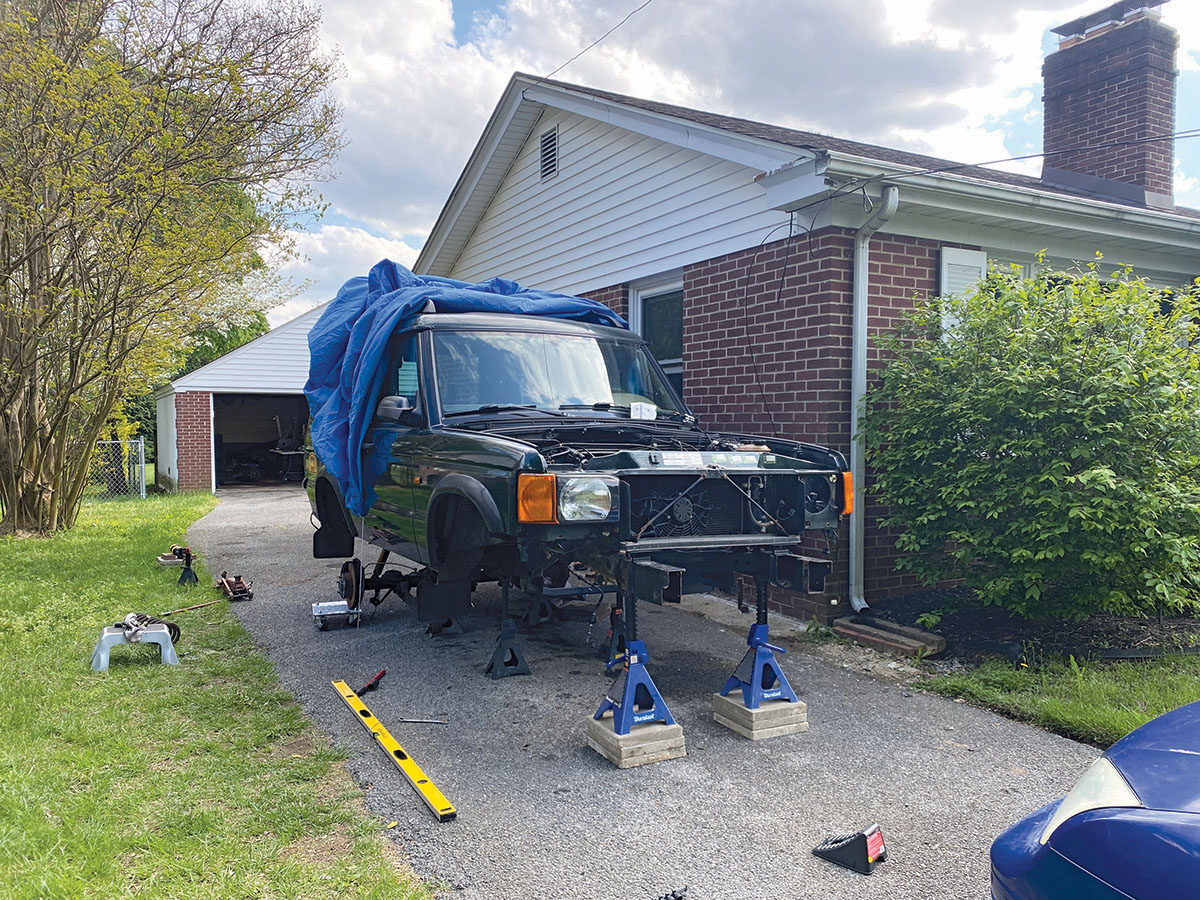 - ‘00 Discovery II – or at least, the shell of one – resting on blocks, covered modestly in its blue cloth surgical gown